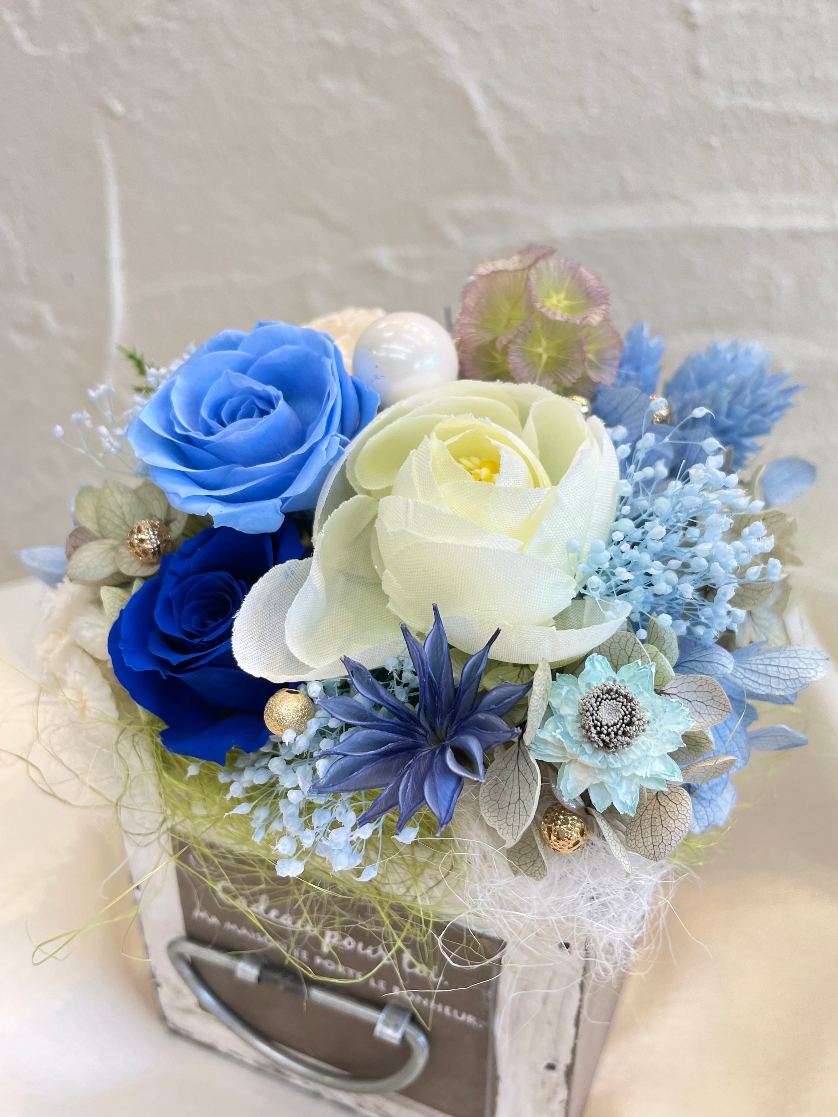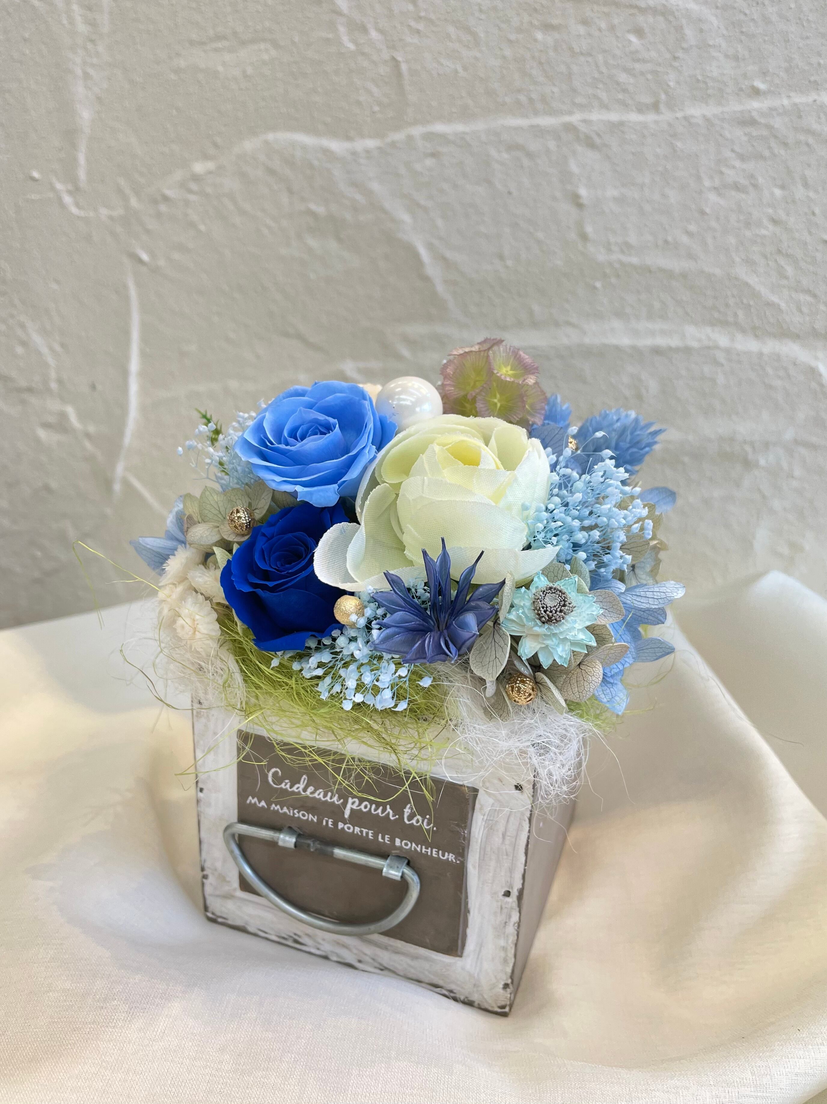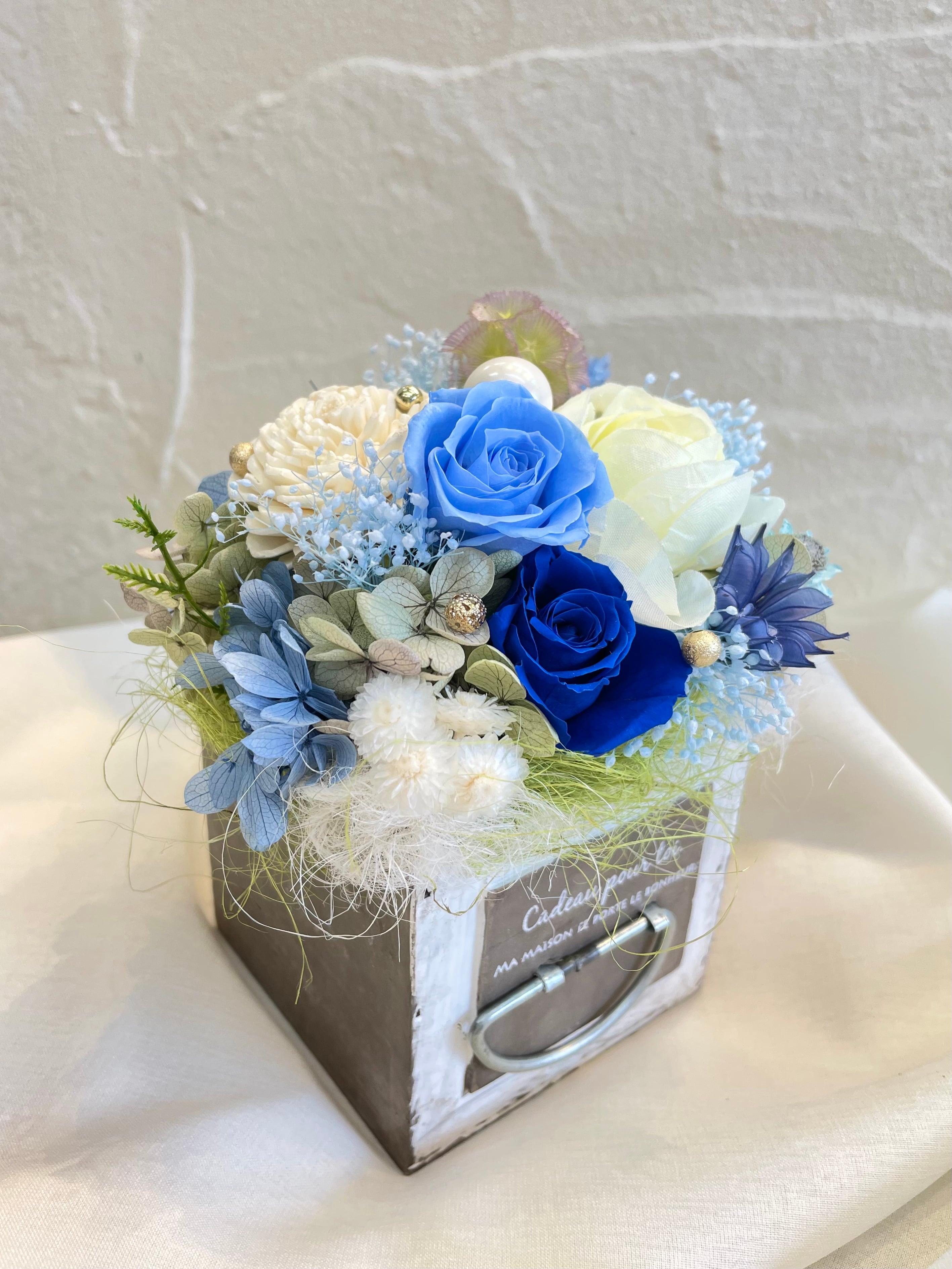 爽やかなブルーとホワイトのプリザーブドフラワーとアーティシャルフラワーを使用しました。