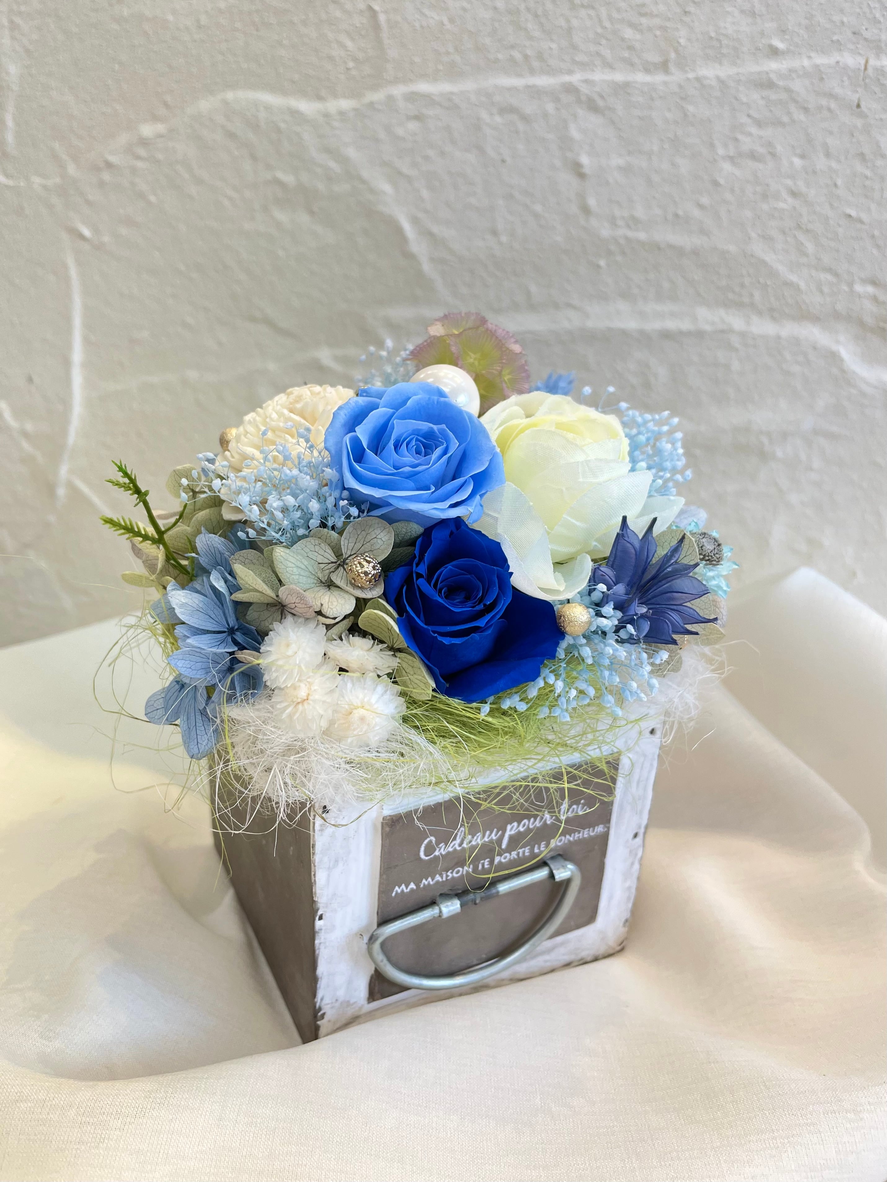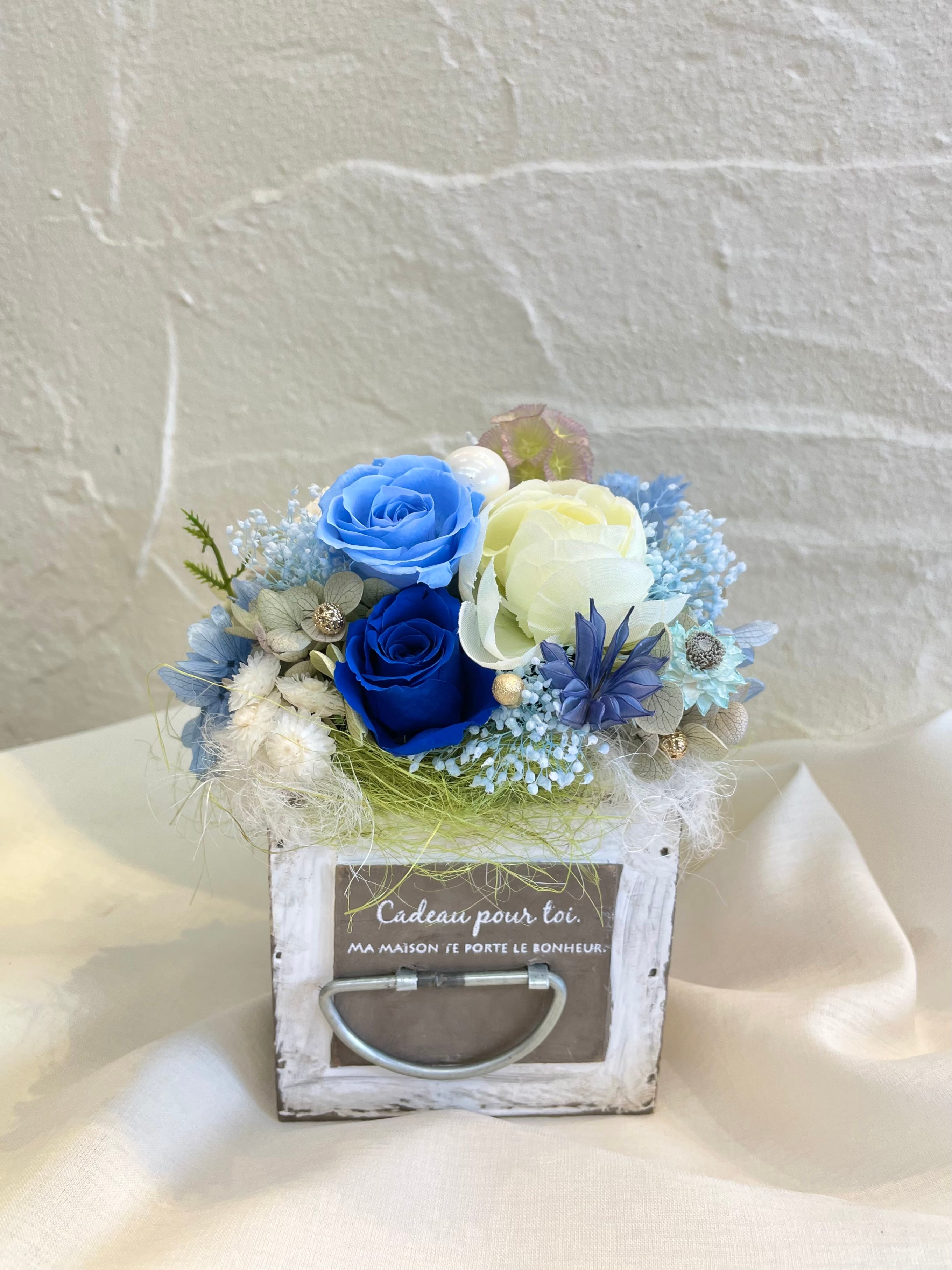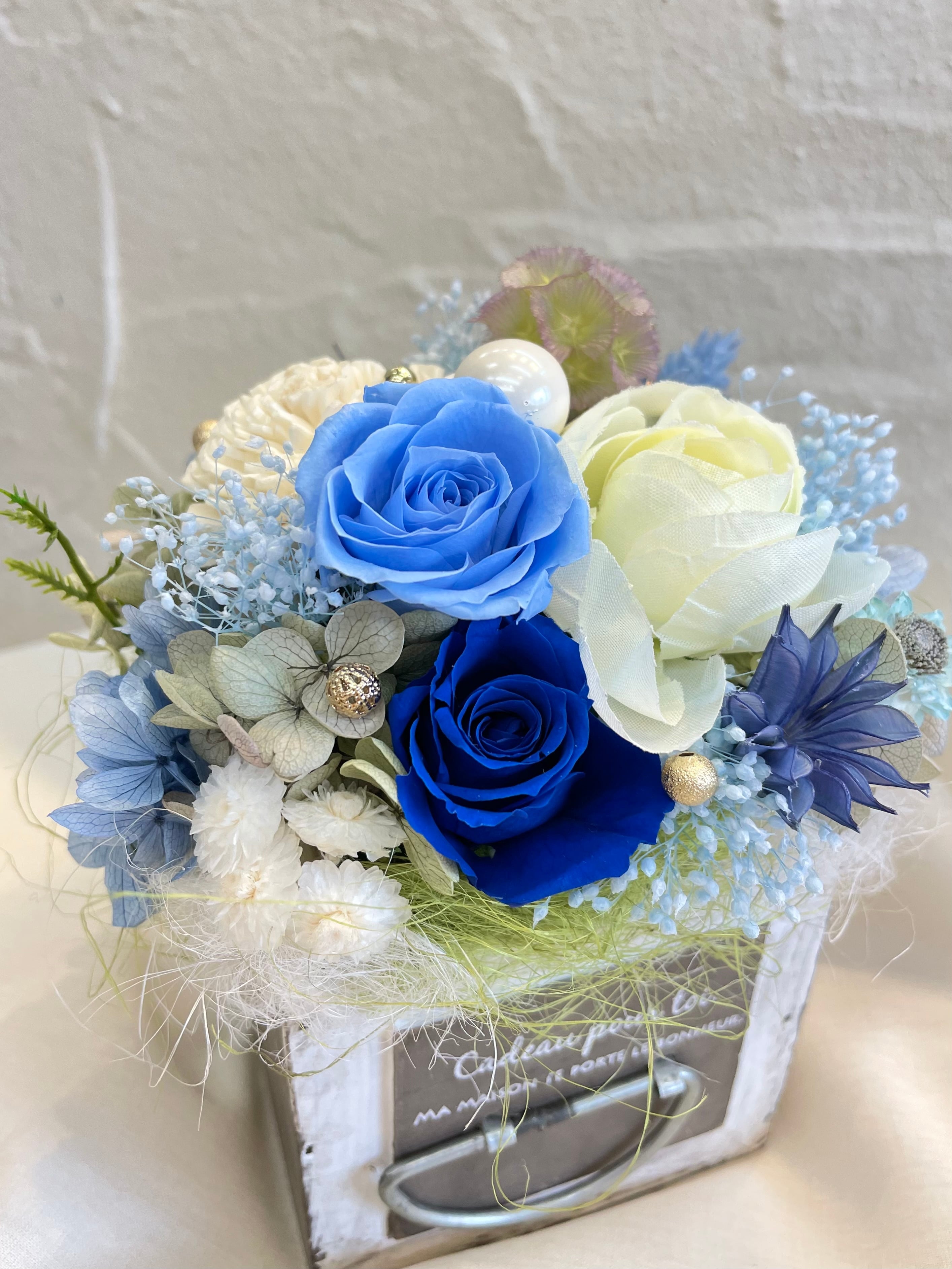 爽やかなブルーとホワイトのプリザーブドフラワーとアーティシャルフラワーを使用しました。