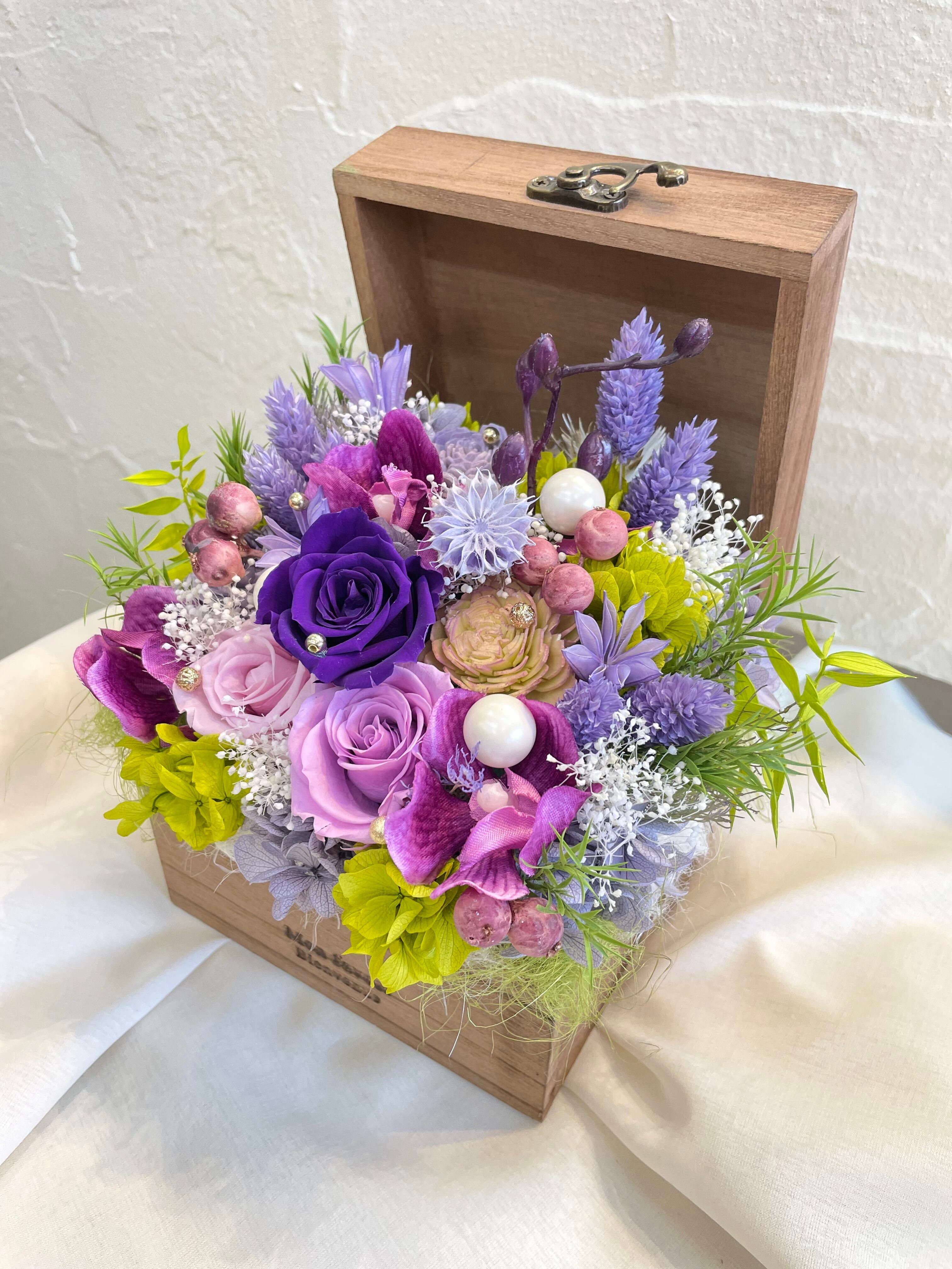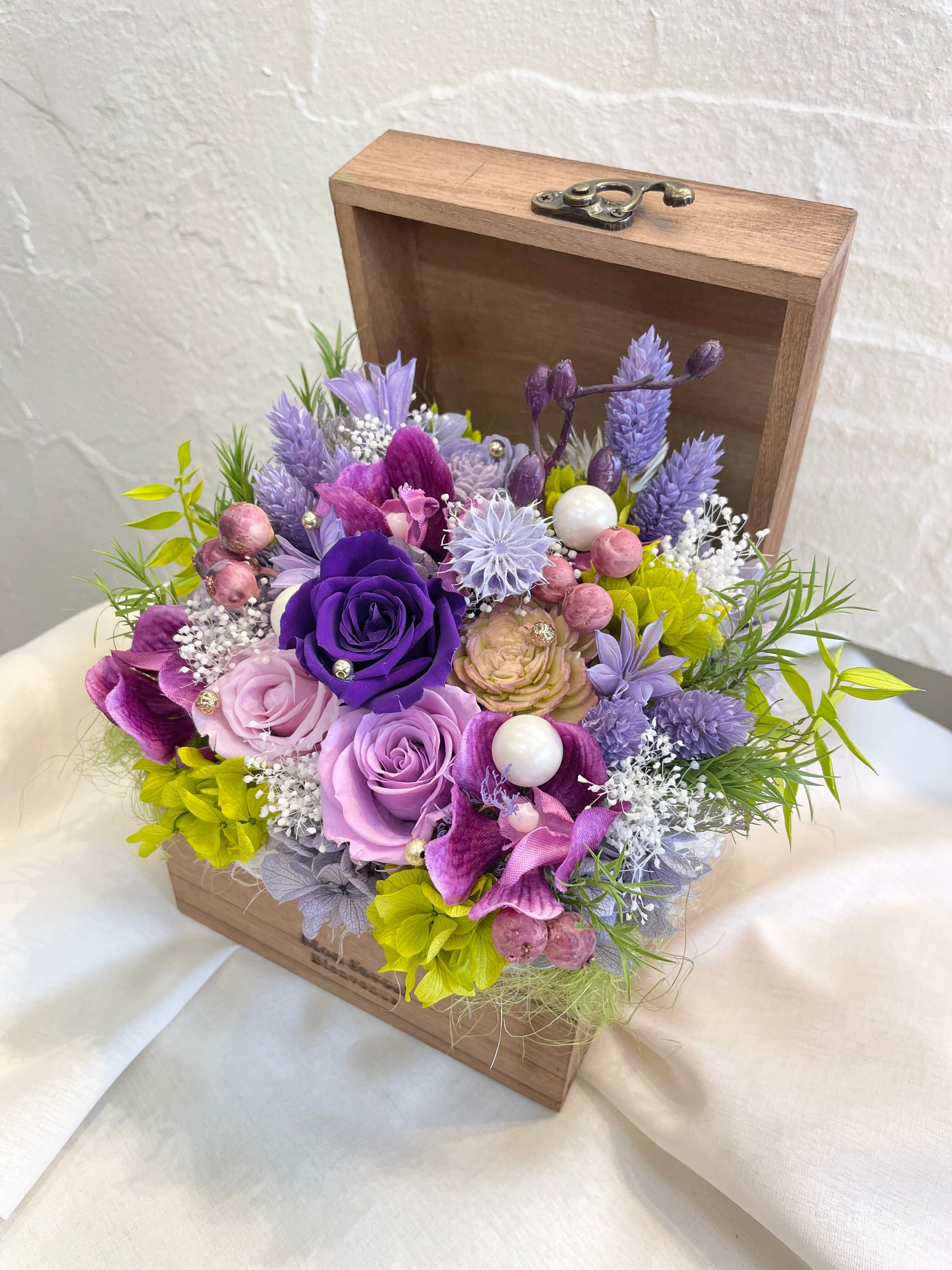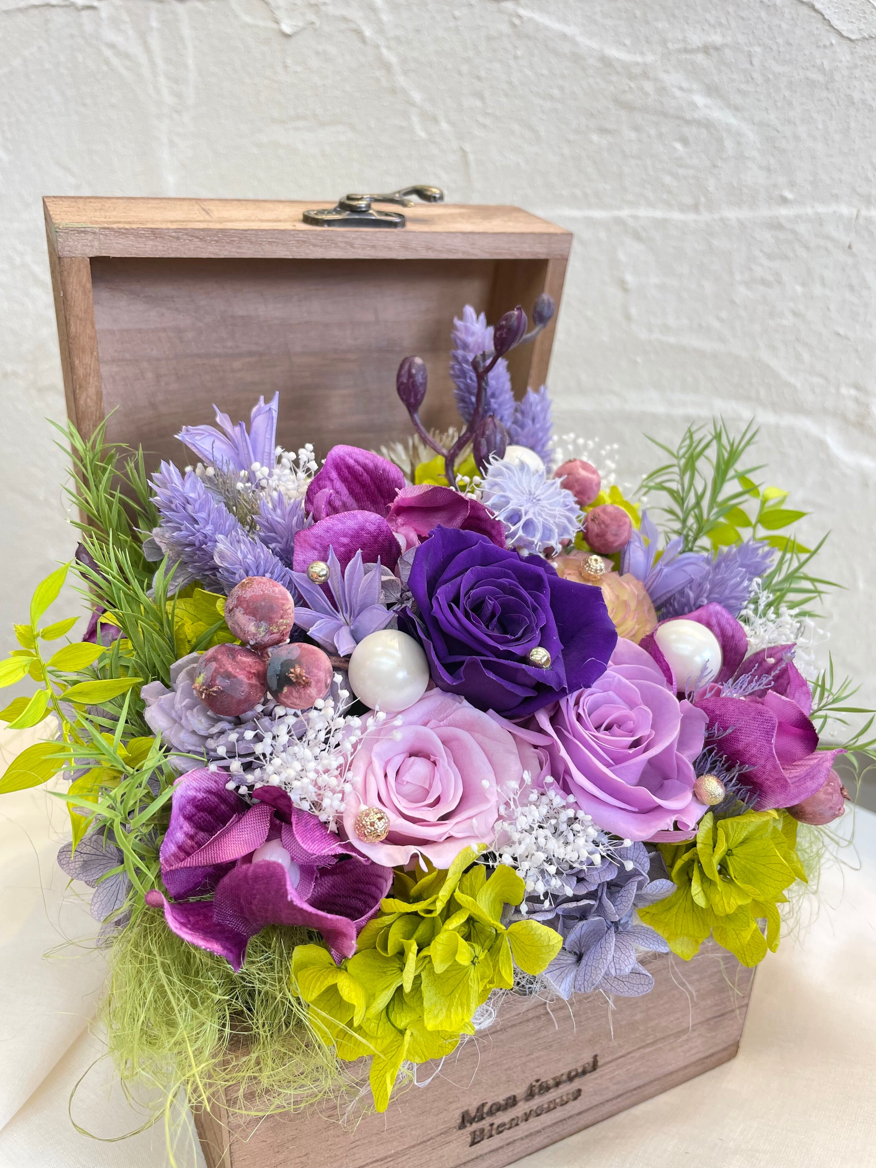 上品なパープルカラーの作品で、洗練されたプリザーブドフラワーとアーティシャルフラワーがバランスよく組み合わせてあります。