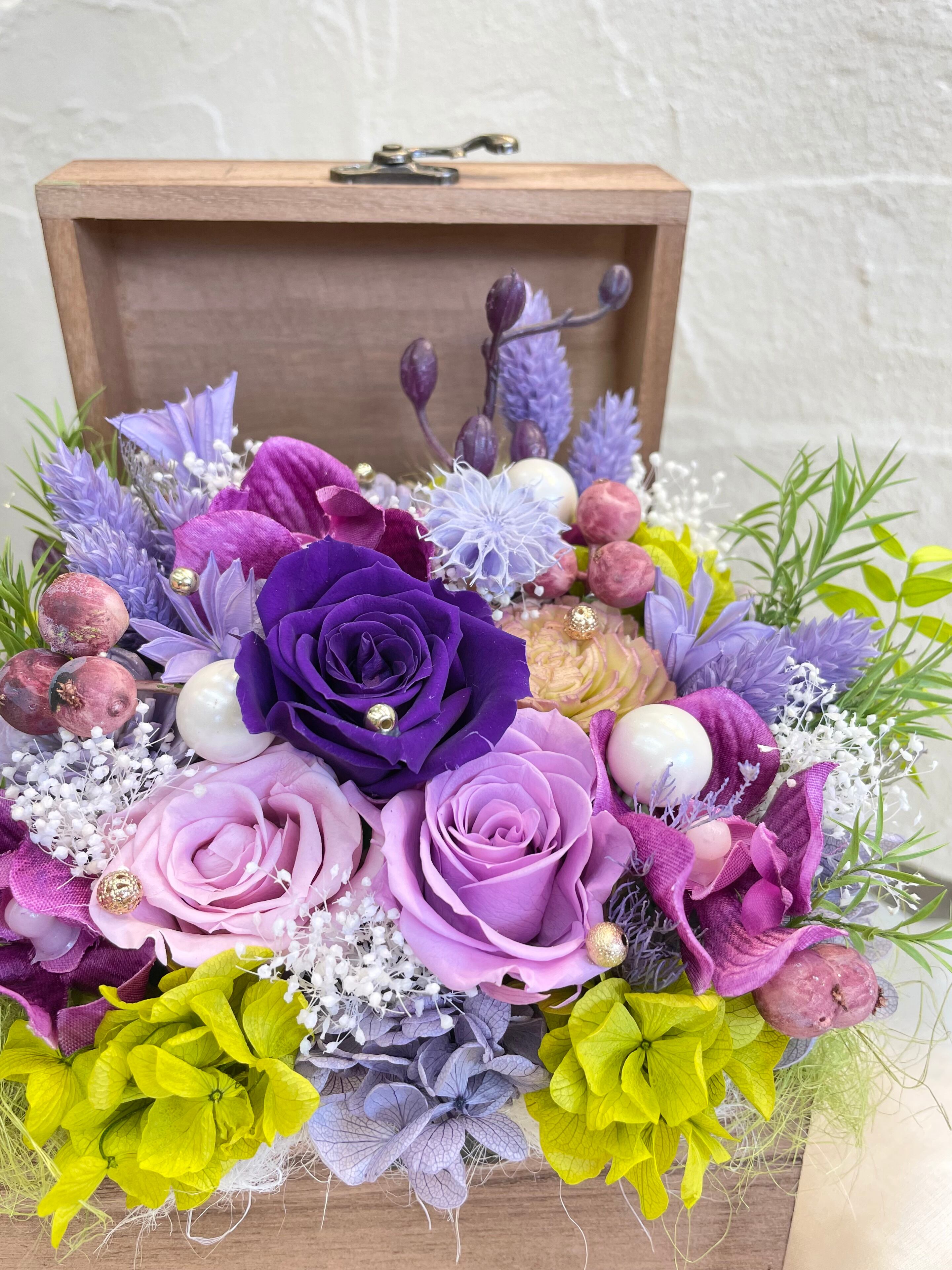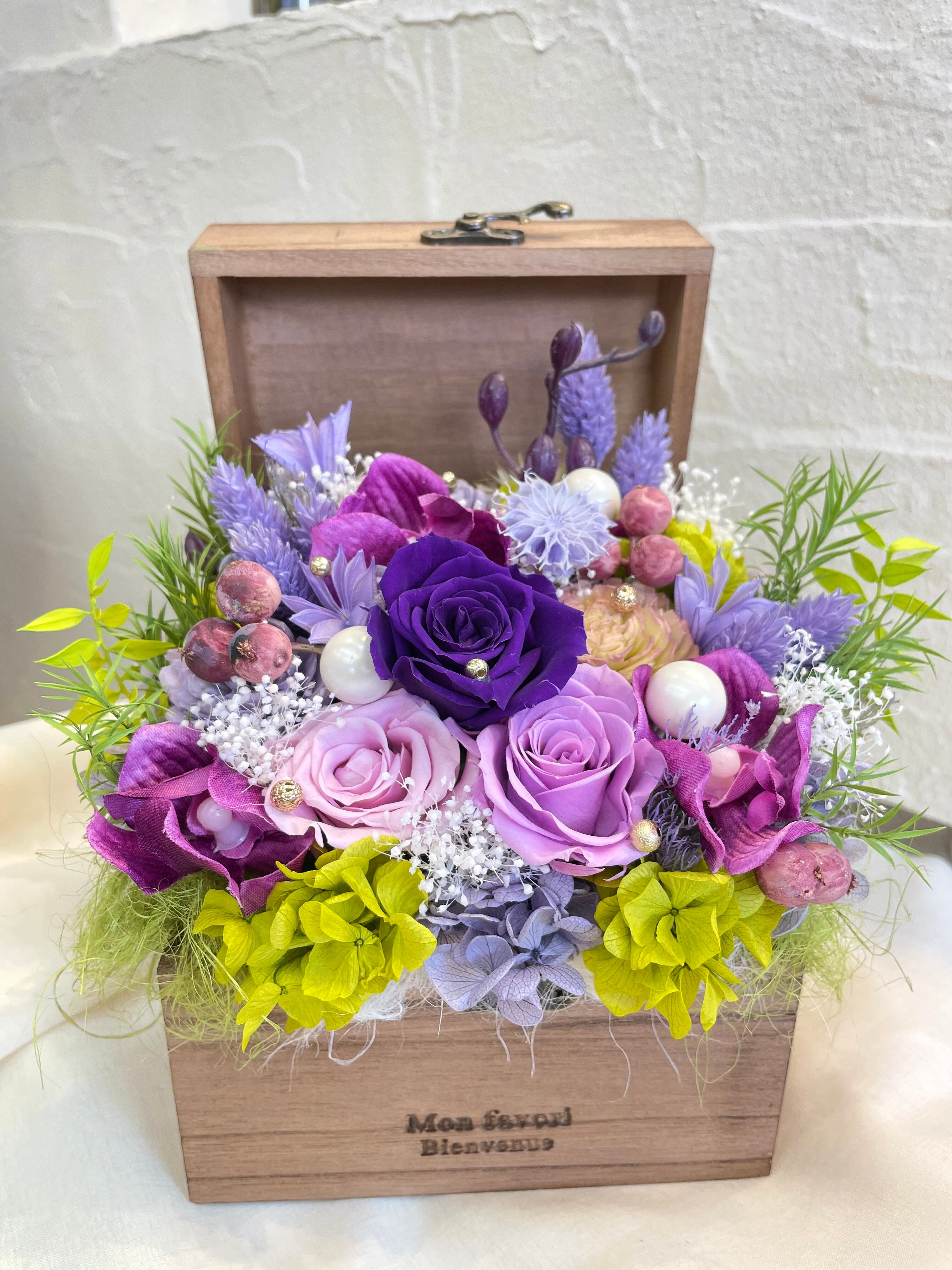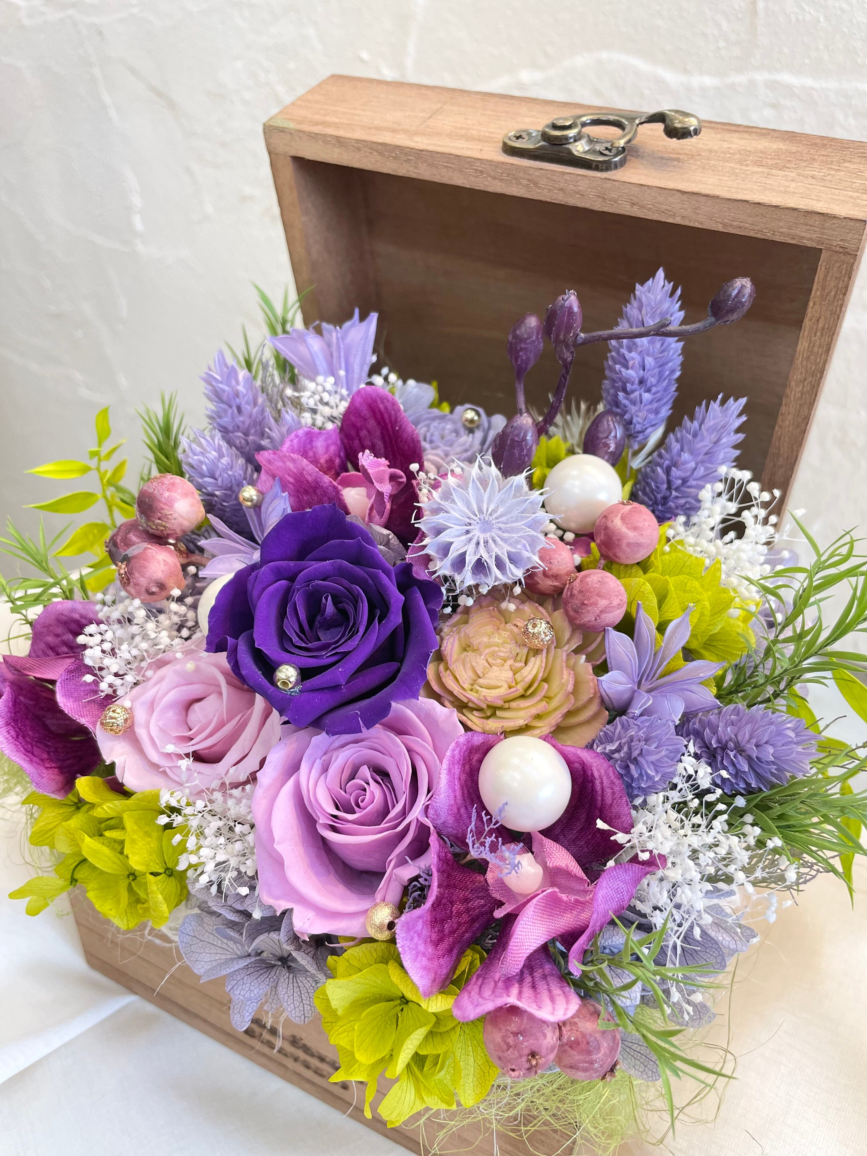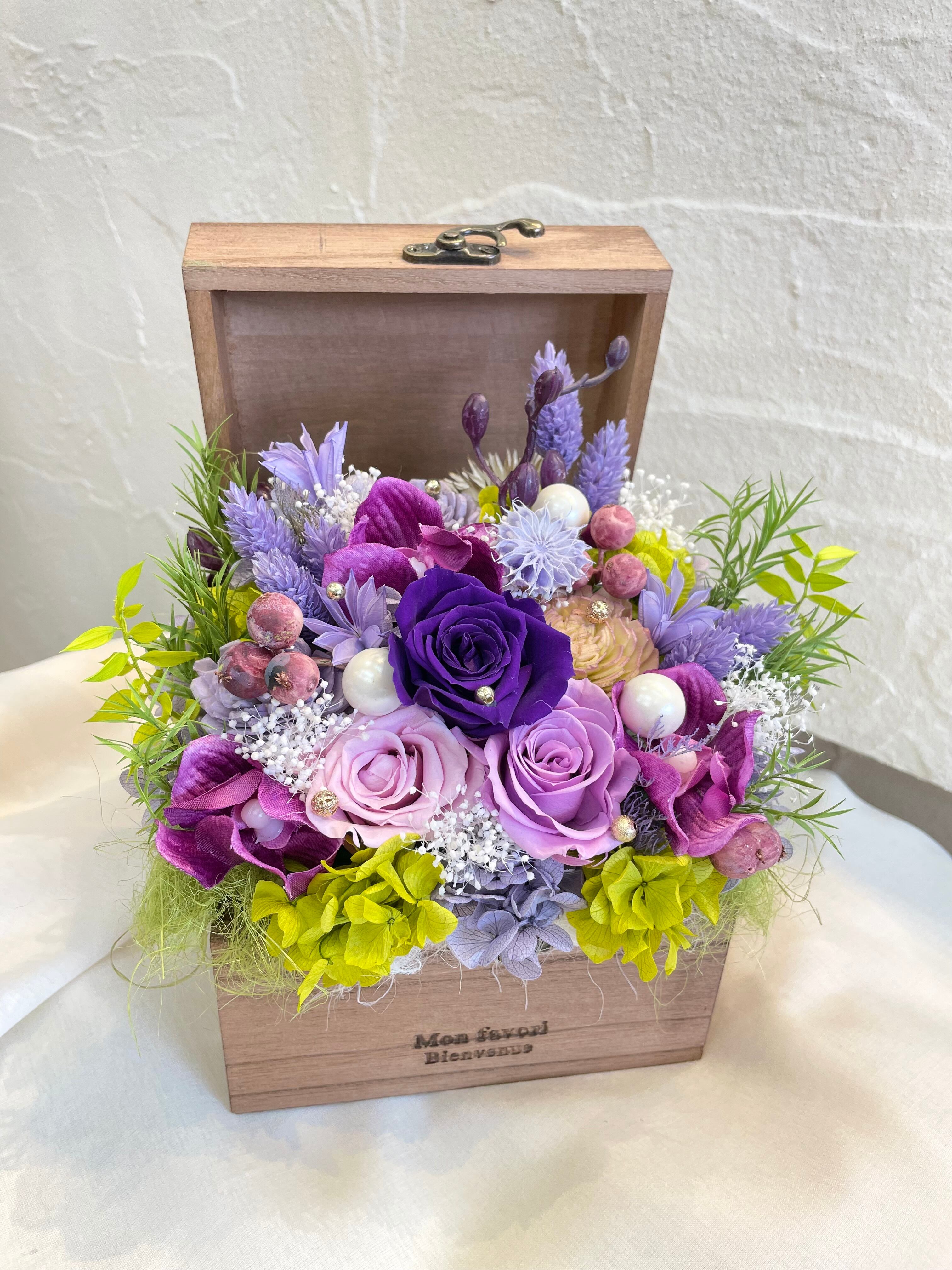 上品なパープルカラーの作品で、洗練されたプリザーブドフラワーとアーティシャルフラワーがバランスよく組み合わせてあります。