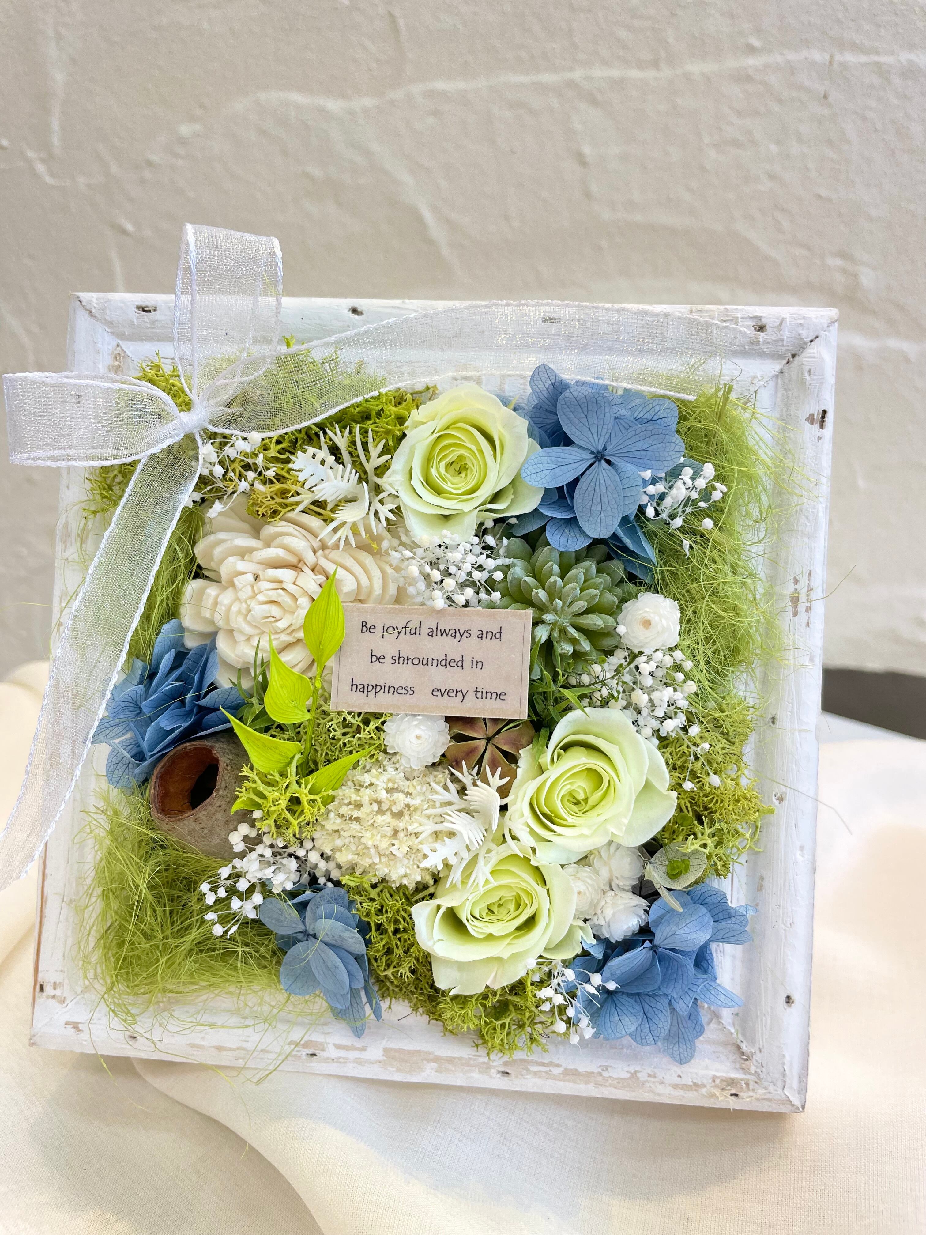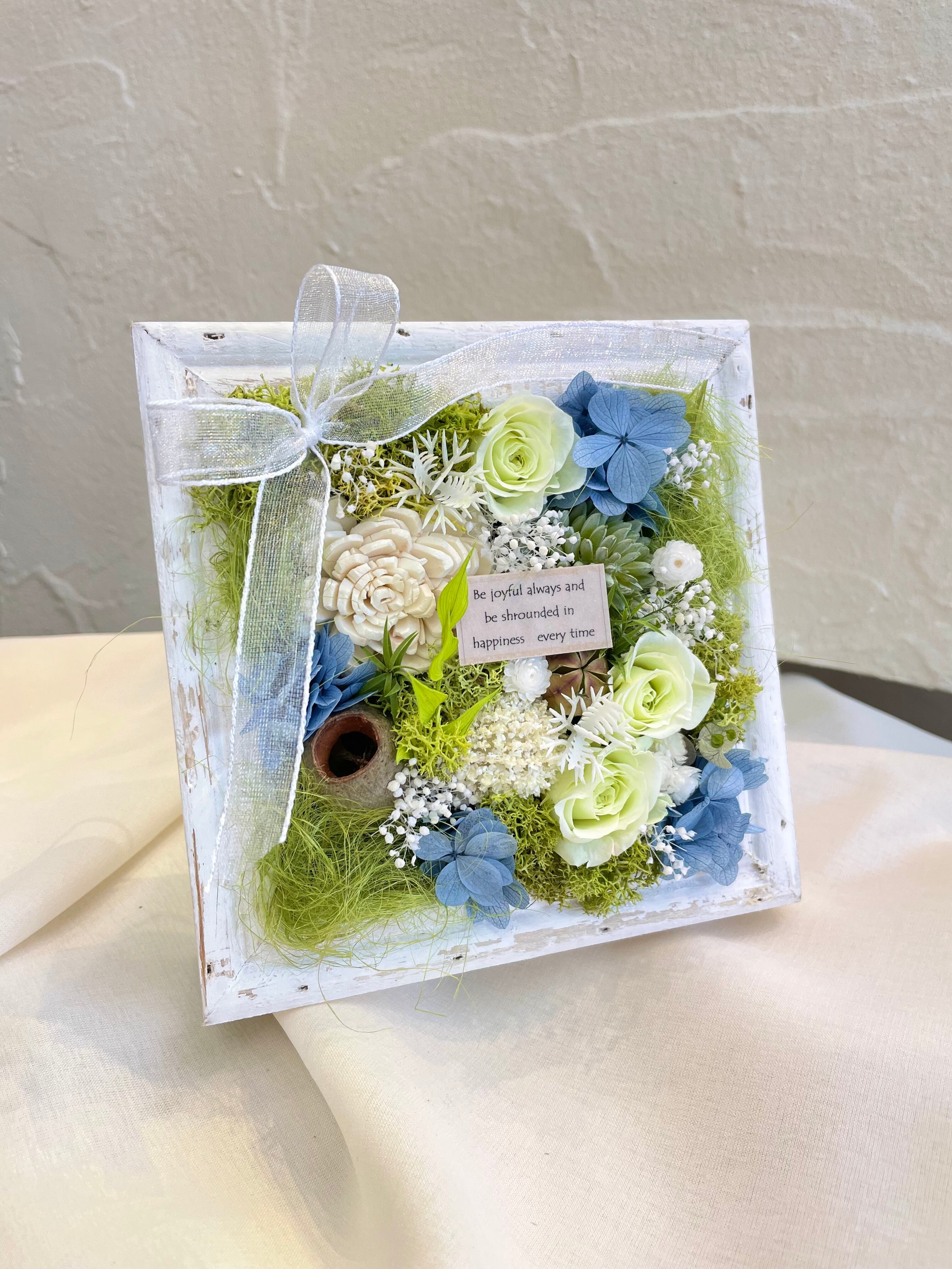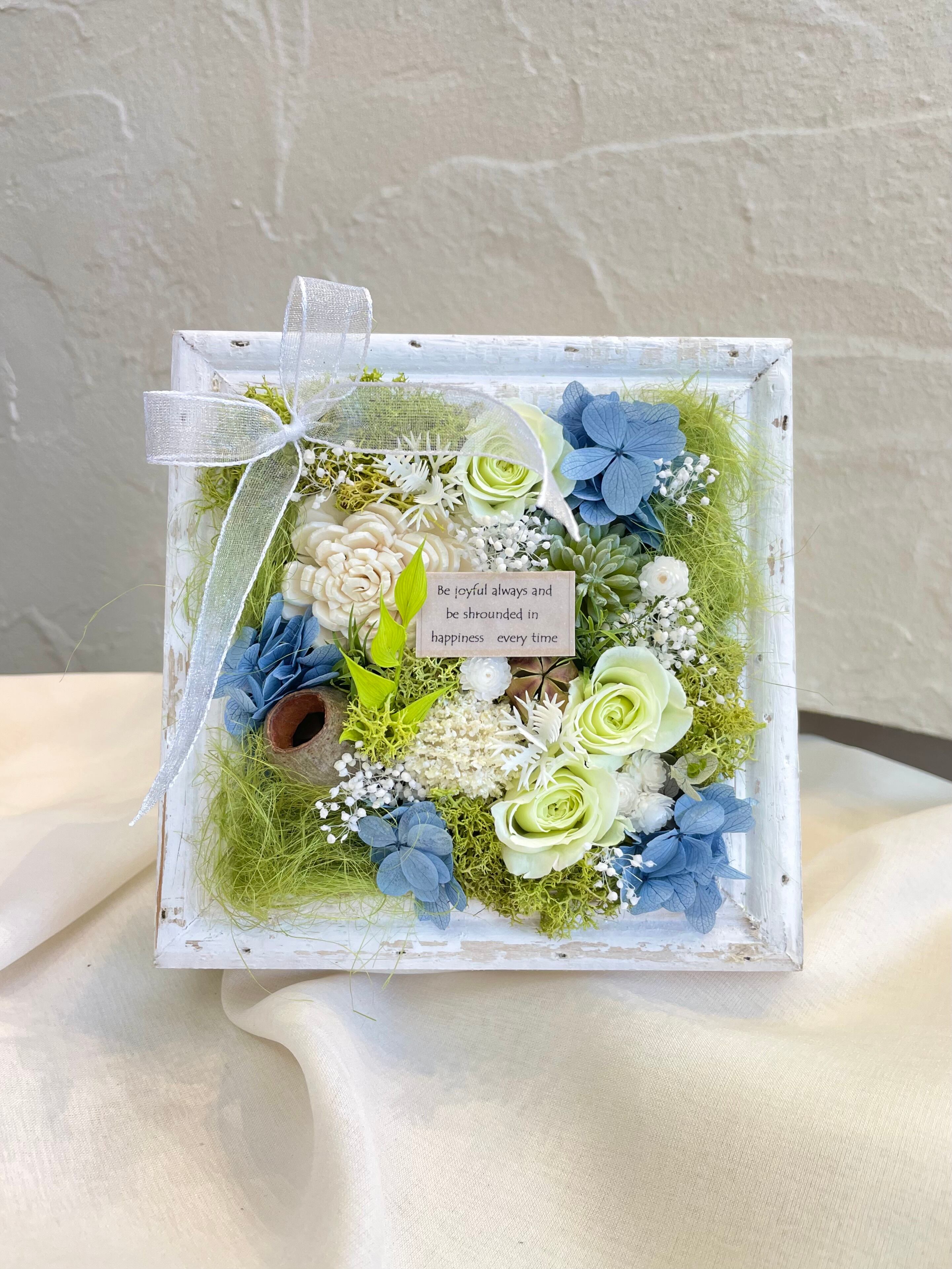ナチュラルでかわいいプリザーブドフラワーが使用されており、穏やかなブルーの色合いが心を和ませます。