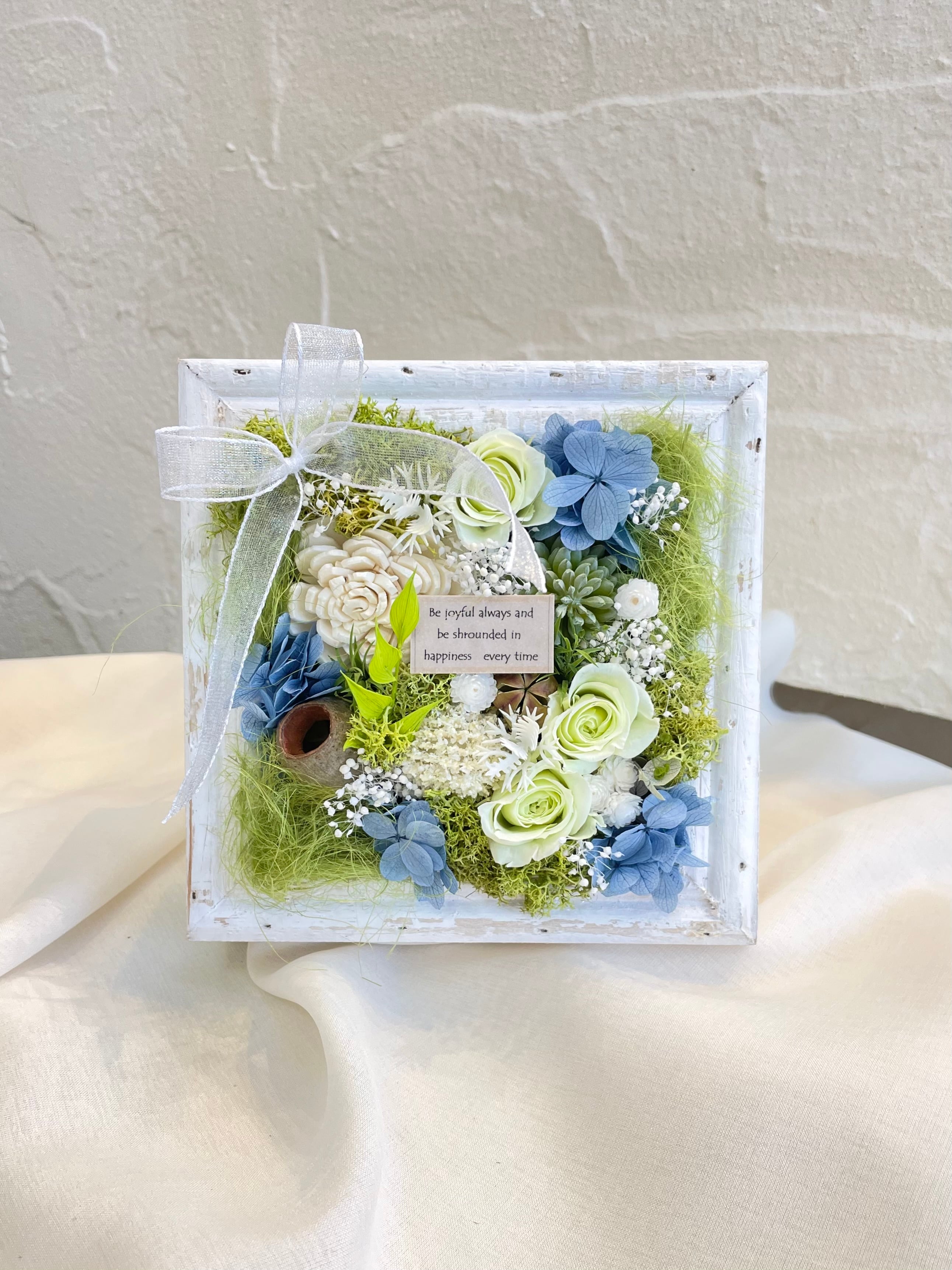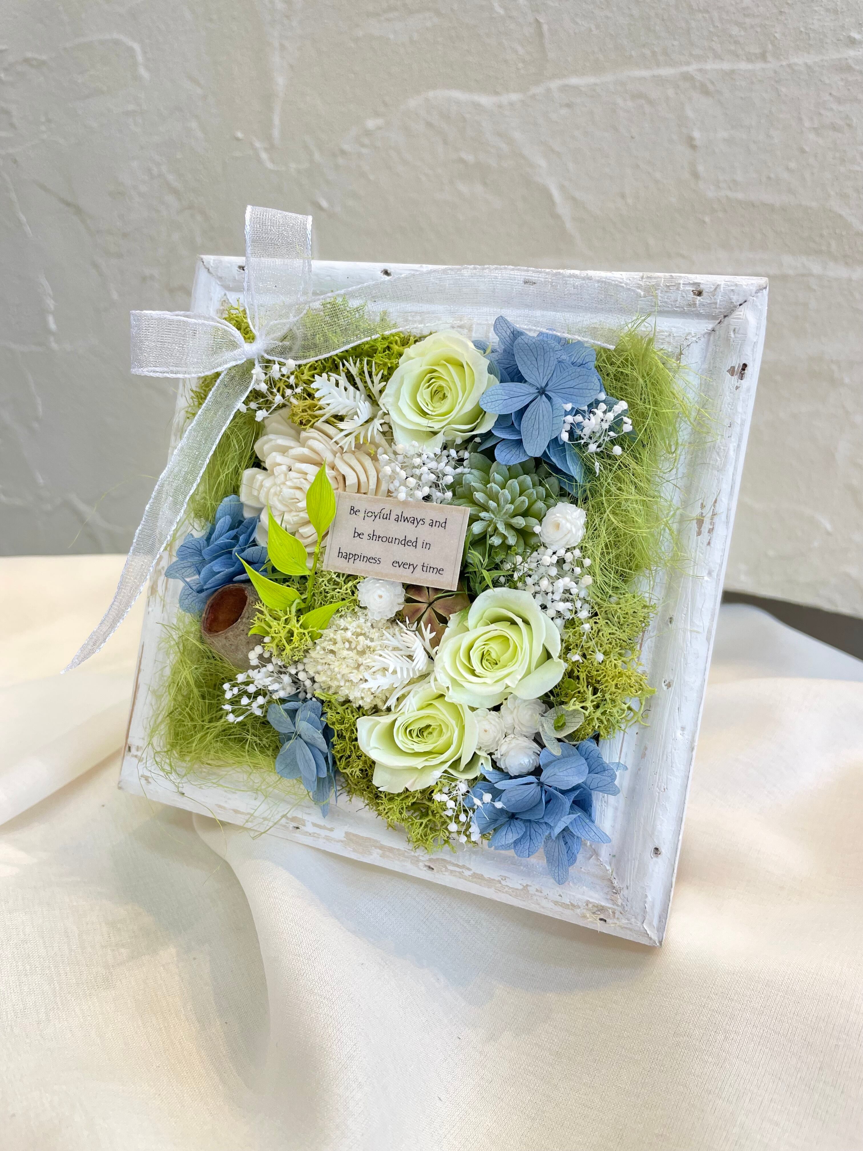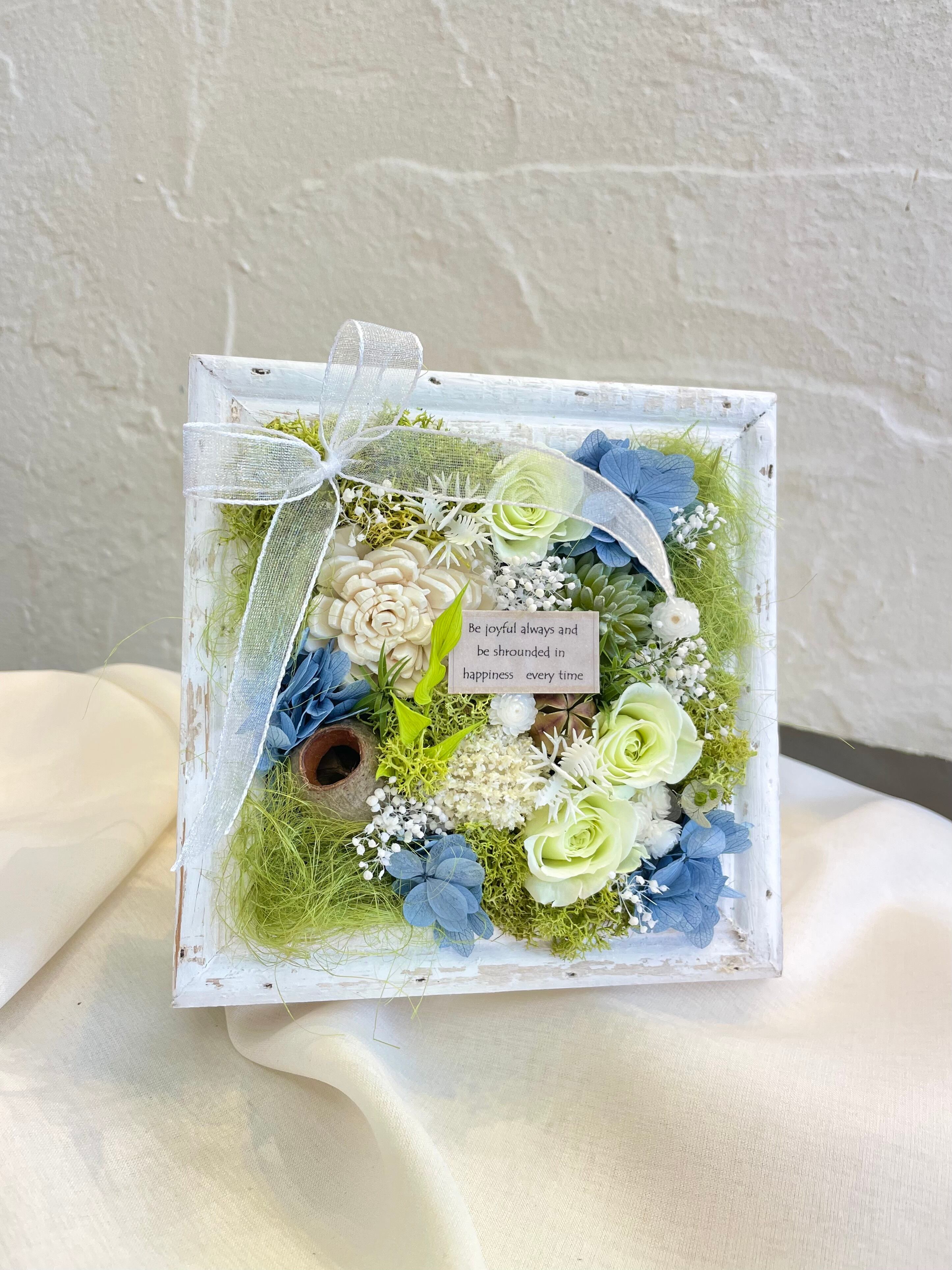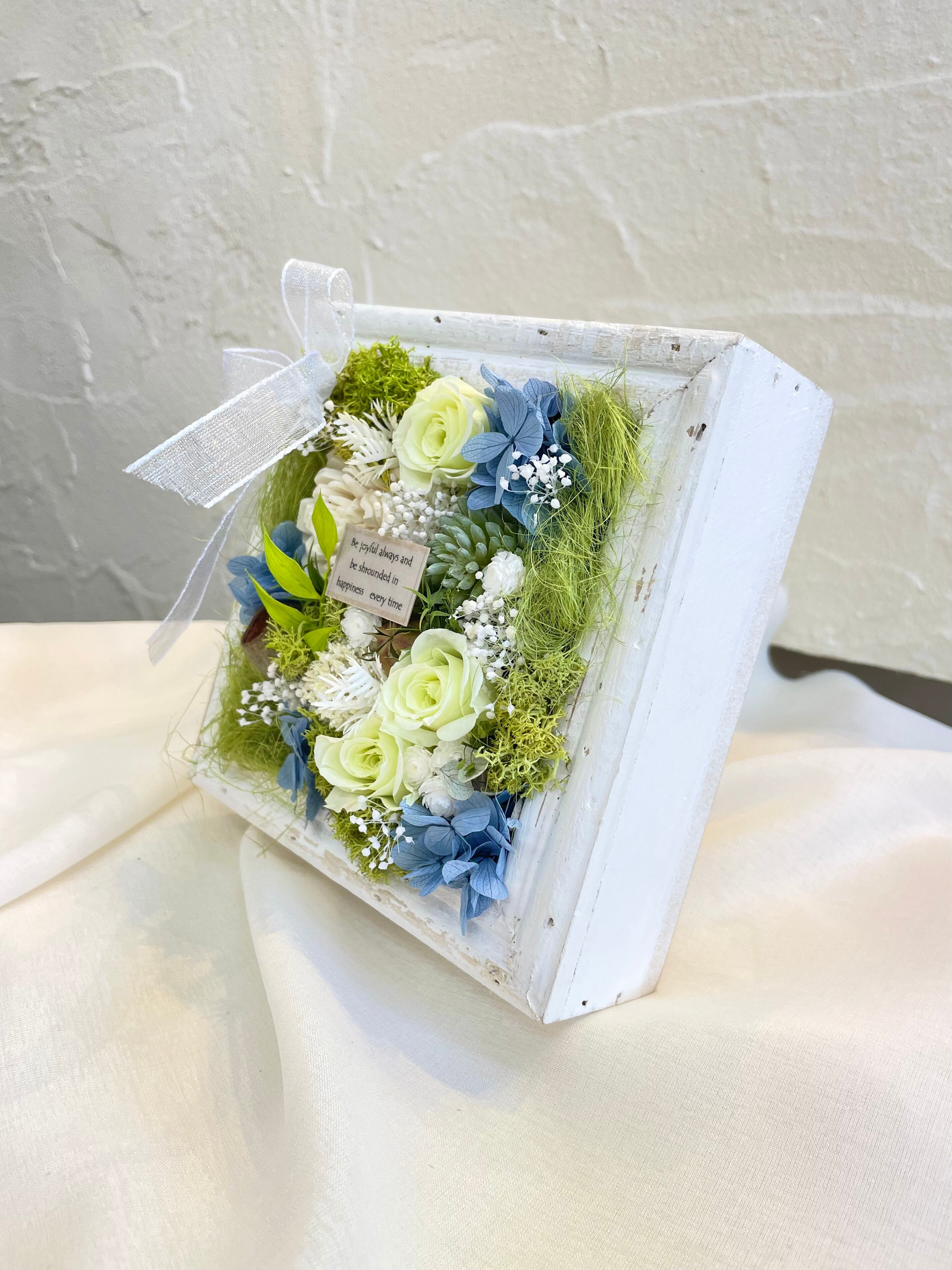 ナチュラルでかわいいプリザーブドフラワーが使用されており、穏やかなブルーの色合いが心を和ませます。